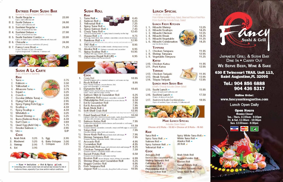 Welcome to Fancy Sushi - St. Augustine, where culinary artistry meets fresh flavors. Conveniently located at 630 E Twincourt Trail, our diverse menu offers something for everyone, from delectable sushi rolls to sizzling hibachi delights.